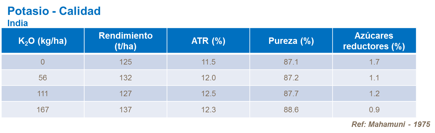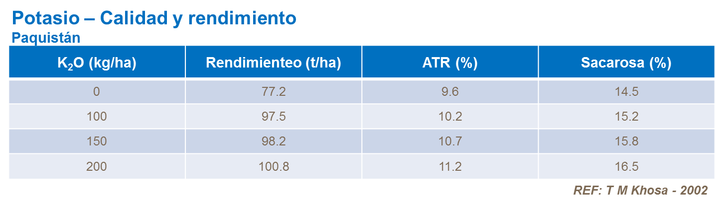 En ensayos con aplicaciones de potasio foliar 6 a 8 semanas antes de la zafra, los investigadores reportaron un incremento de 15,1% en °Brix, y 20% en Pol y una reducción en contenido de fibra de 28%. También es importante tener suficiente potasio disponible para poder usar el nitrógeno asimilado en la caña para tener una buena maduración del cultivo y asegurar que los azúcares reductores se conviertan a sacarosa.