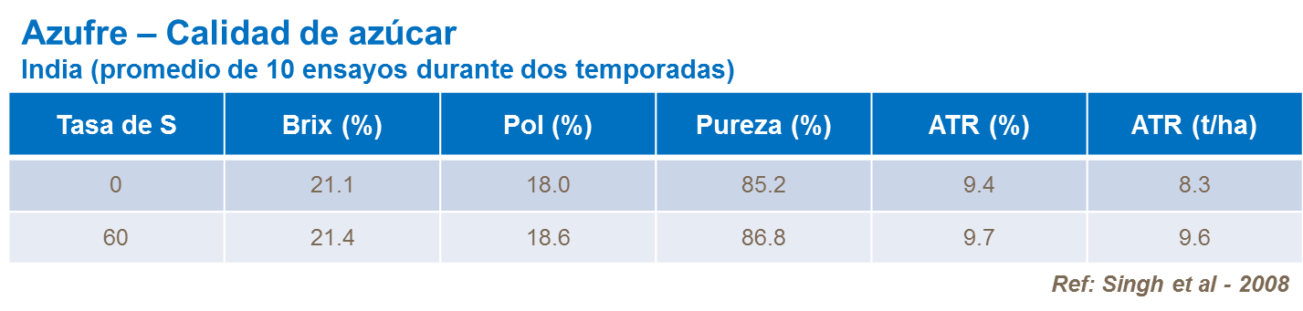 Estudios confirman que el azufre tiene efecto en una gama de características que influyen la calidad de azúcares, incluyendo Brix, Pol, pureza del jugo y ACC.