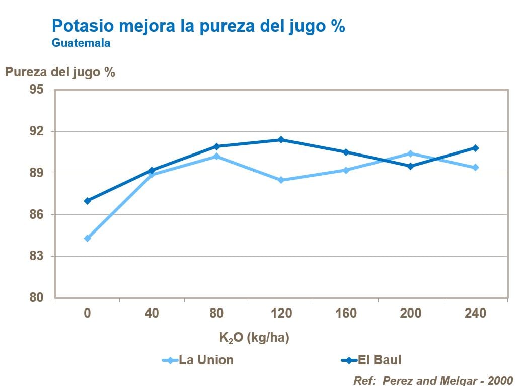 Por otra parte, un consumo excesivo de potasio puede afectar adversamente la cristalización del azúcar y produce una menor recuperación de azúcar cruda y refinada, lo cual lleva a pérdidas mayores de azúcar en la melaza. Un exceso de K también aumenta el contenido de ceniza en el jugo de caña de azúcar.